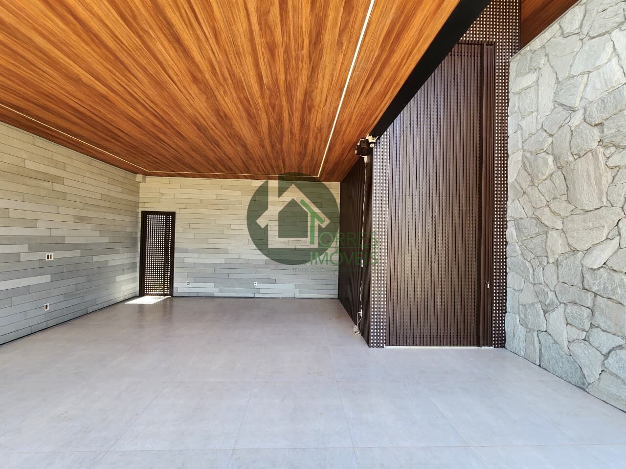 Fachada em pedra natural Escandinávia, esquadrias Concept, piso porcelanato 88x88 e travertino natural.