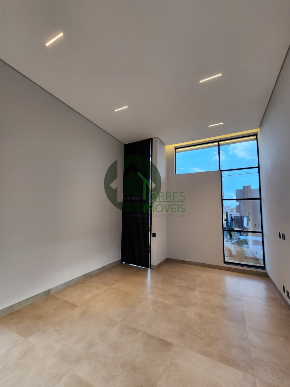 Living amplo com *pé-direito duplo*, iluminação natural impecável e integração total com a área gourmet e a garagem.