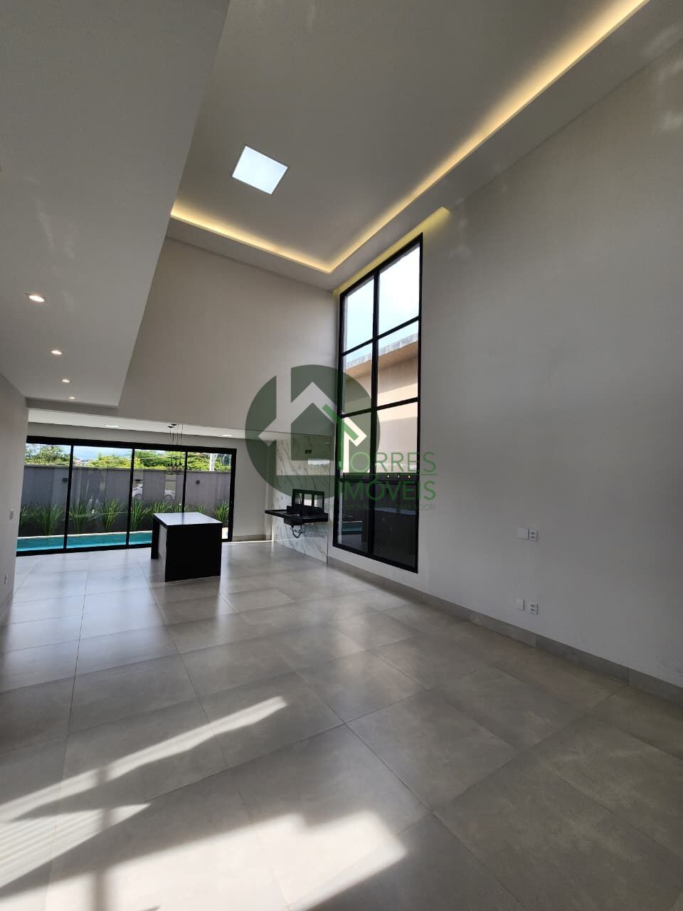 Sala bem ampla com pé direito duplo.