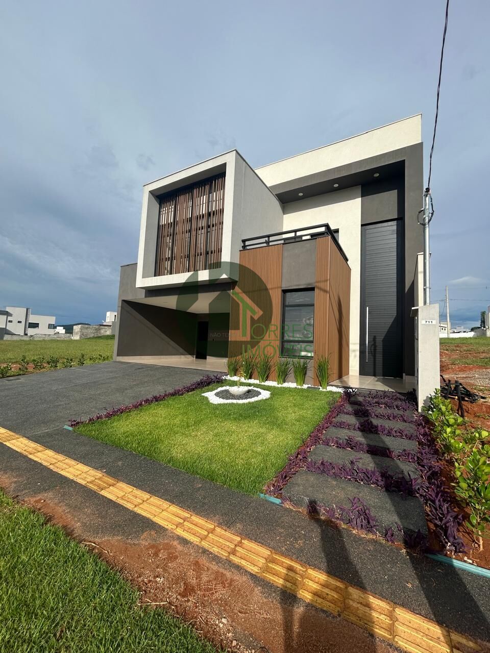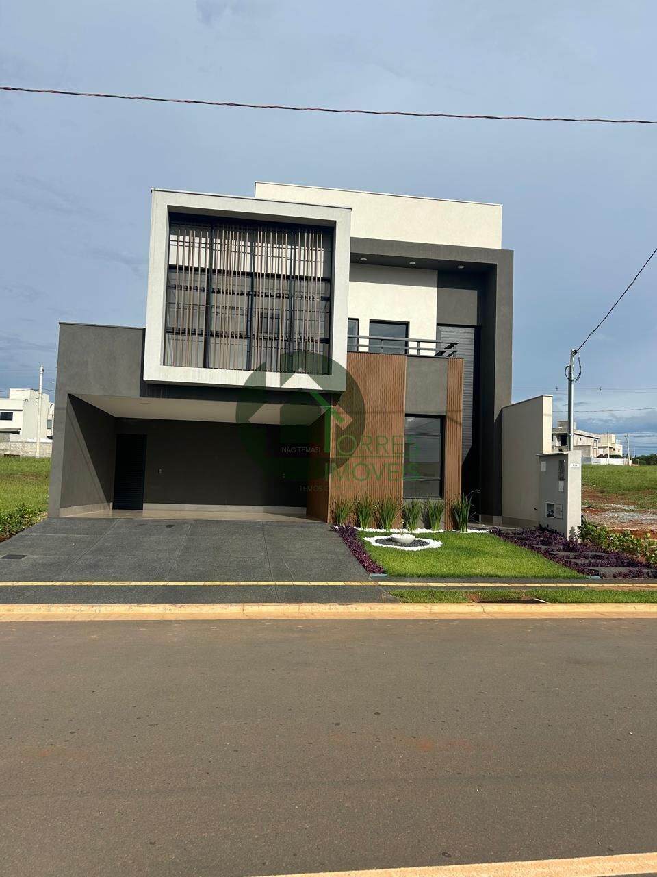 Fachada imponente com pé direito duplo, ripados e brises em WPC Amadeirado.