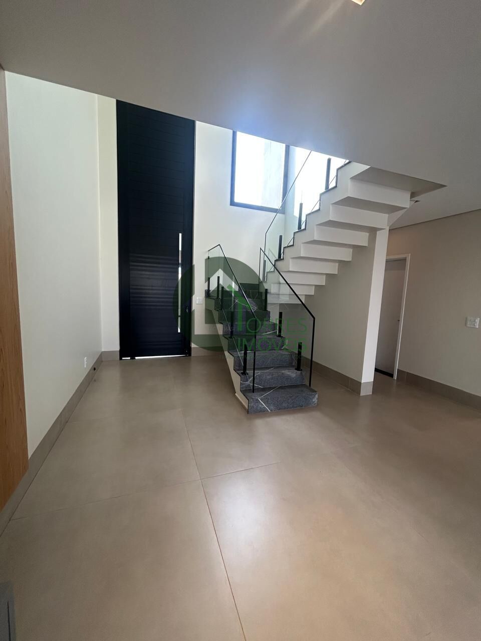 Escada em pedra com Guarda Corpo em vidro.